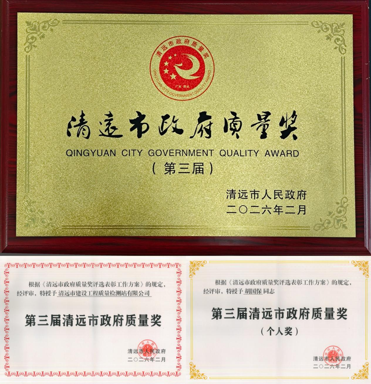 2月10日,市政府通报表彰了第三届清远市政府质量奖获奖组织和个人,清远市建设工程质量检测站有限公司(以下简称“建工质检站公司”)荣获第三届清远市政府质量奖组织奖;城科集团总工程师、建工质检站公司董事、总经理胡国保荣获第三届清远市政府质量奖个人奖。