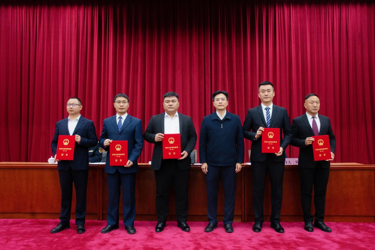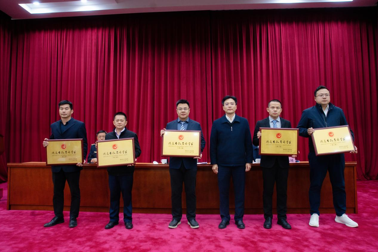 图为授予第三届清远市政府质量奖组织奖,437ccm·必赢国际集团党委委员、副总经理、城科集团董事、总经理孔宪文领奖(左三)